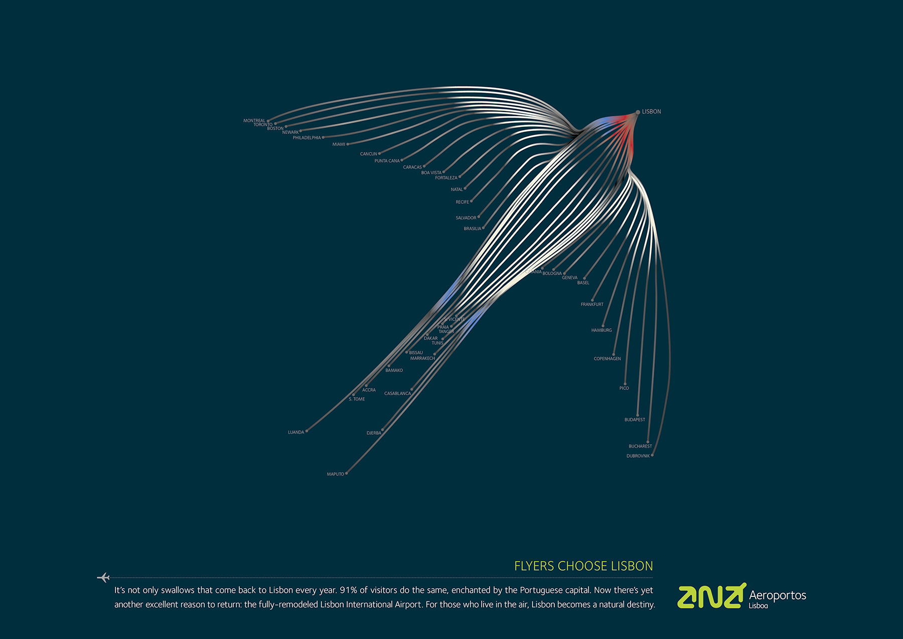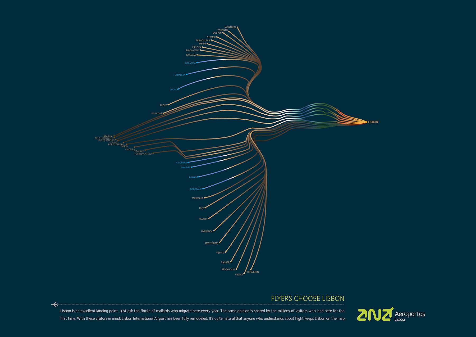 This year’s campaign features a series birds that illustrate each of the direct flight routes from Lisbon with the tagline “Flyers Choose Lisbon”.
