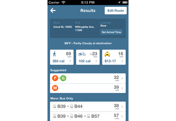 The success of Citymapper stems not from arcane algorithms but from brilliant unification of data from the MTA, Google Maps, Apple Maps, OpenStreetMaps and Forecast.io. The integrated real-time data results in a treasure of transportation information at your fingertips instantaneously. And best of all, it’s free.