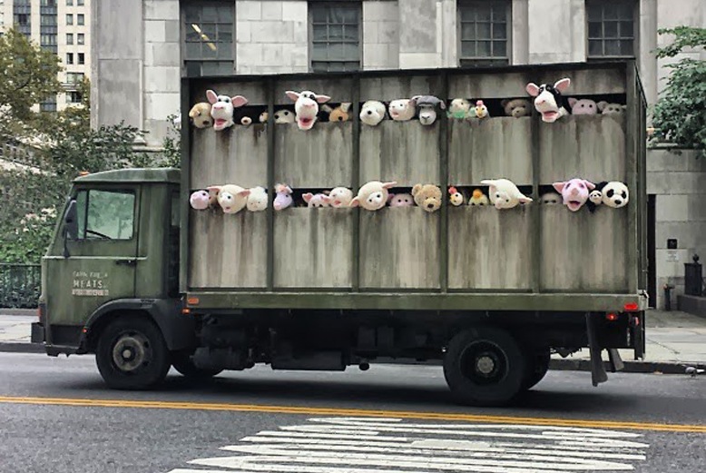 Now that the hub-bub is over, what was your favorite piece (if you care)? I’m split between the rolling, animatronic, abattoir-bound animals and the wistful “banality of evil” Nazi portrait at the Housing Works Bookstore.