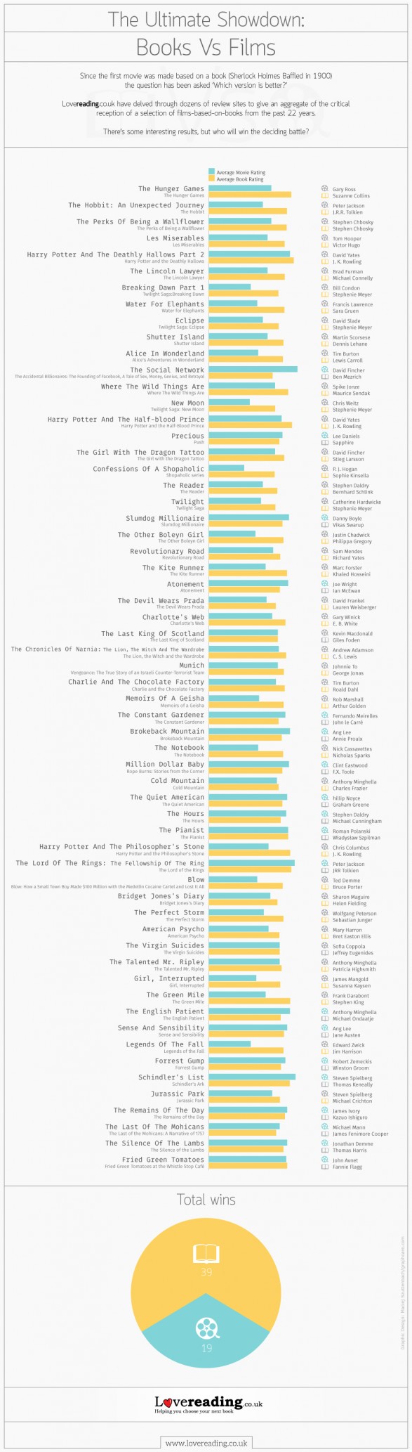 The British book selection website Lovereading has created an interesting infographic called, “The Ultimate Showdown: Books Vs. Films”, which asks the question, “which is better the book or the film?” for popular films based on books for the past twenty-two years. The graphic covers an aggregate of reviews for both books and movies and compares perceptions of which is better. It’s not always an easy choice, but I usually lean towards the book.