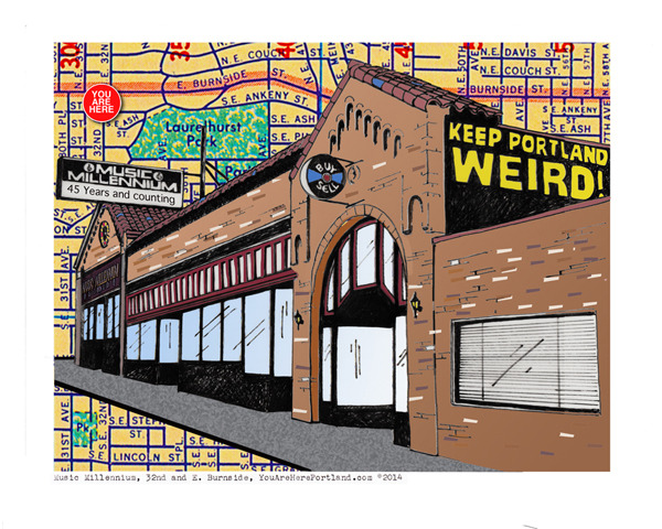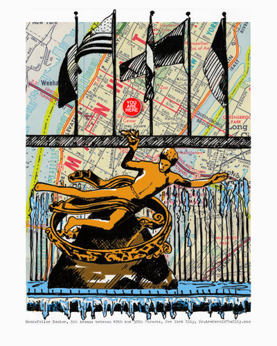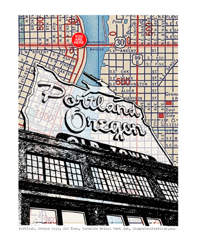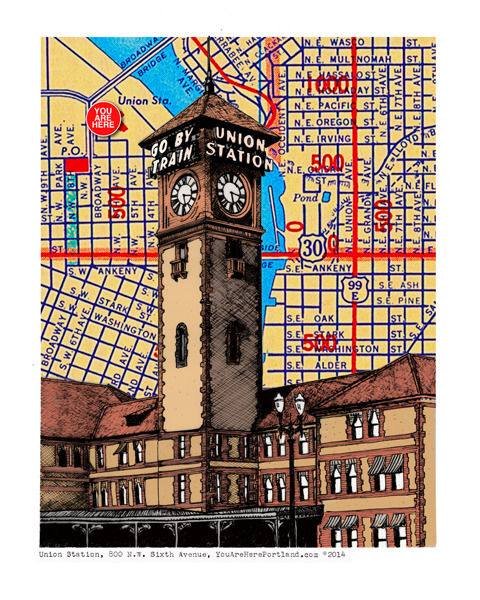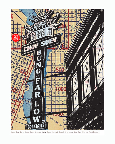 Portlandian graphic artists and printmakers Lyn Nance-Sasser and Stephen Sasser create these remarkable archival pigment prints by superimposing popular, local,iconic spots on vintage 50s tourist maps. Their clever You Are Here In The City series currently features prints from hometown Portland, Seattle, San Francisco and NYC. The couple plan to expand the series to include cities such as Miami Beach, Nashville and Baltimore. To further that end, they’ve launched a Kickstarter campaign. Check it out here. I’m already in for a t-shirt.