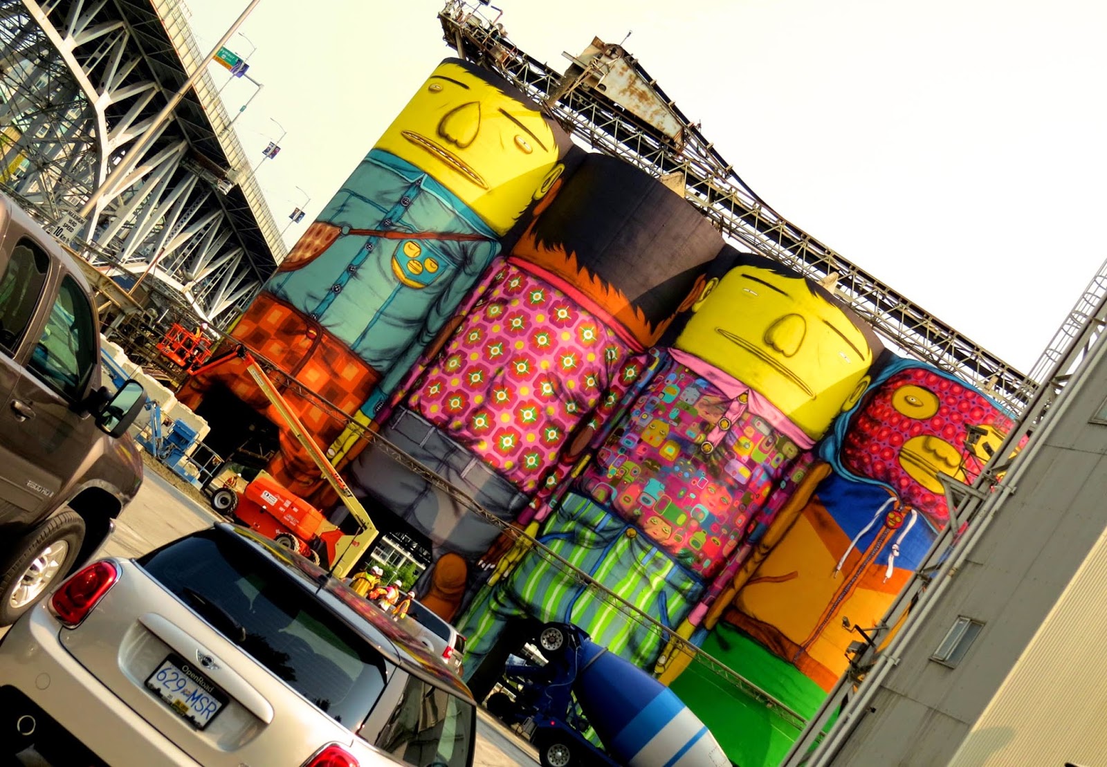 I was chuffed to be in Vancouver for the official unveiling of Brazilian street art duo Os Gemeos’ first Canadian and largest ever work. The enormous project for the 2014 Vancouver Biennale transformed six boring cement silos on Granville Island into a colorful 3D mural.