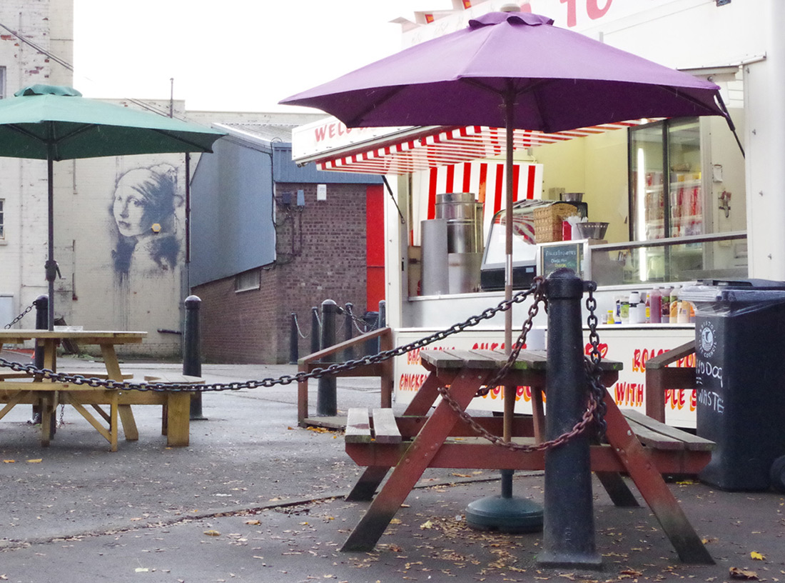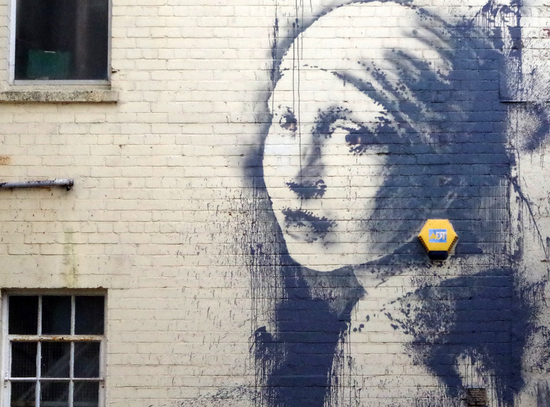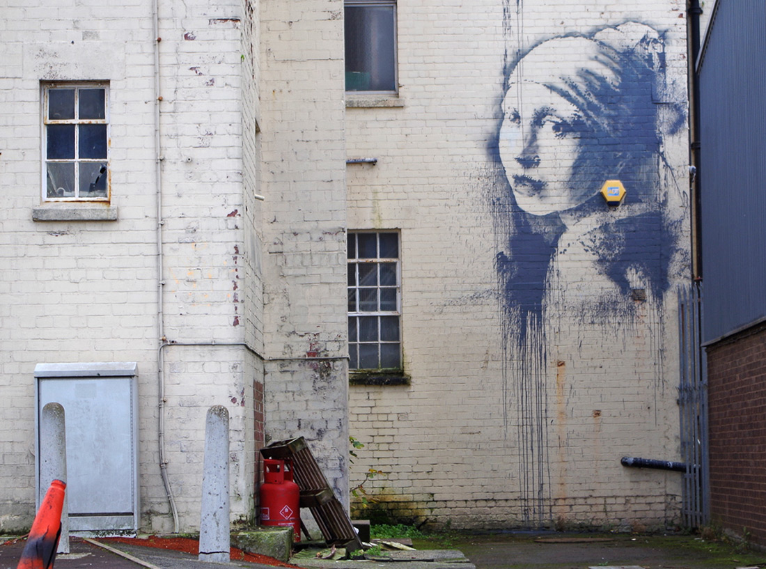 Banksy painted a new piece this week titled “Girl With a Pierced Eardrum”. The parody (or paean) is a take-off on Vermeer’s beloved “Girl With a Pearl Earring”. The work can be found at the Albion Dockyard in Banksy’s purported hometown of Bristol. UK.
