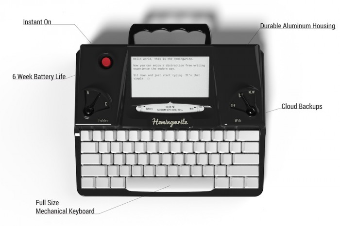 Designed like an old-fashioned typewriter, the Hemingwrite is a single purpose writing device. Combining the simplicity of 80s era word processors with modern tech, such as wifi, Bluetooth and cloud backup to Google docs and Evernote, the retro-modern tool aims to provide a distraction free writing environment for the user. Not yet for sale, the Hemingwrite will offer a one million plus page memory, a six-inch E ink screen, six plus week battery life, a mechanical keyboard and high contrast, backlit screen for indoor or outdoor use.