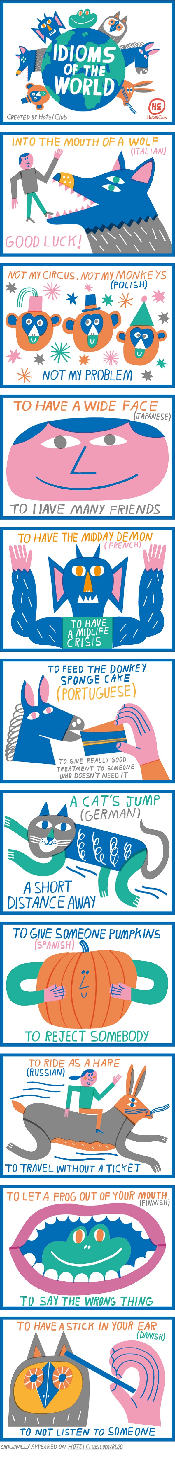 If you’ve ever been confused by a foreign language idiomatic expression during your travels, you’ll enjoy “Idioms of the World”. Artist and illustrator Marcus Oakley incorporated some of his favorites for this infographic that he created for the HotelClub travel website.