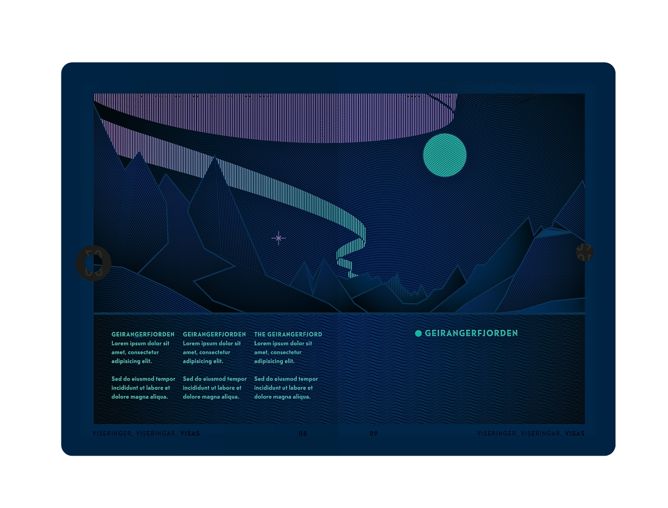 The coral red, robin’s egg blue and pale gray covers will certainly stand-out from the typical passport, but the most intriguing design features are on the inside. The passport pages are decorated with beautiful Norwegian mountain and fjord scenes. When the passports are held under UV light, the landscapes turn from day to night and reveal hidden text and floating images evocative of Norway’s northern lights.