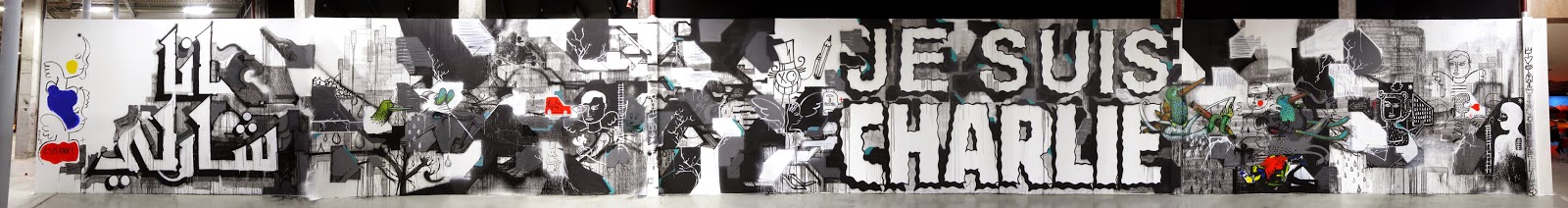 Within 24 hours of the horrific terrorist attack on Charlie Hebdo, a group of Parisian artists came together to create a memorial mural at the Palais de Tokyo contemporary art museum in Paris. Calling themselves “French Kiss”, the collective (which includes Cokney, Lek & Sowat, Hugo Vitrani, Nicholas Gzeley, André, Felipe Batista, and Alëxone) painted a poignant 50 meter-long mural.