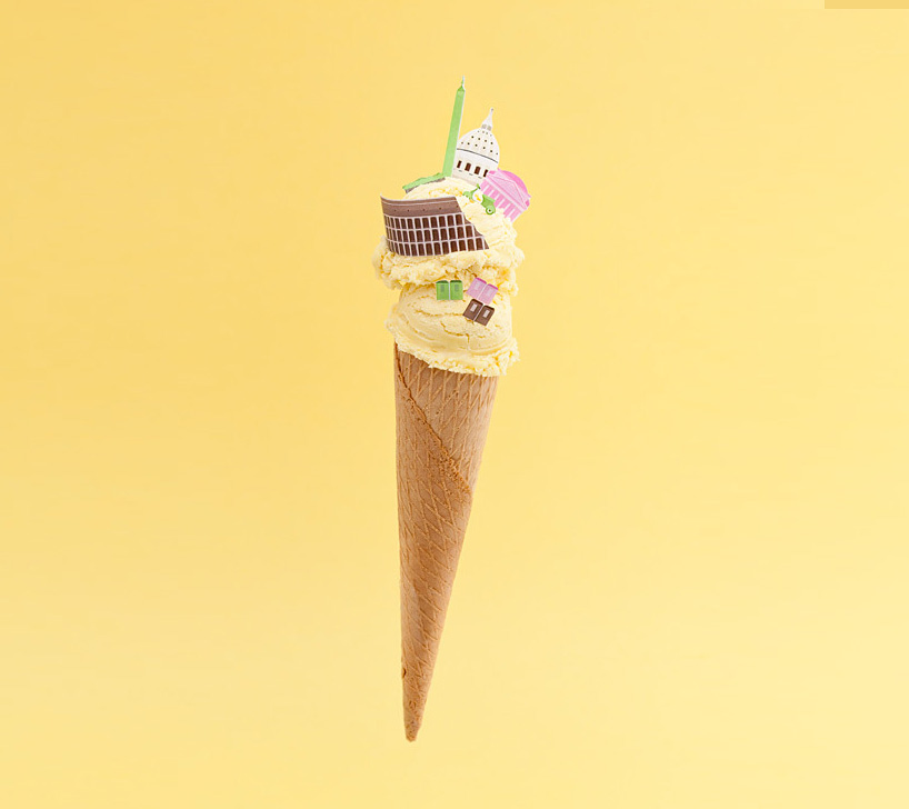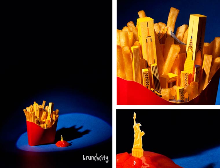 The concept of “doing brunch” seems to be the quintessential urban pastime. Madrid-based illustrator Bea Crespo and photographer Andrea Portoles have collaborated on a marvelously whimsical project called “Brunch City”, which uses popular foods to celebrate the special cultural connection between city dwellers, their famous landmarks, and customary brunch items. Only now I want a plate of pa amb tomàquet and some churros con chocolate.