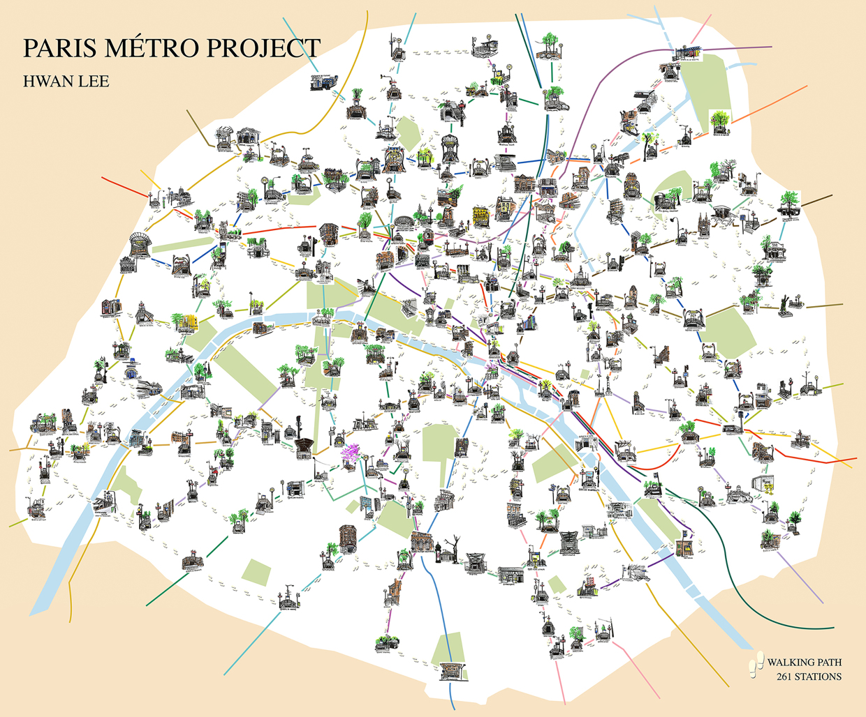 Korean-born, Tokyo-based artist Hwan Lee wanted to get to really know Paris when she lived there as an exchange student. So she decided to create her own map of the city based on 261 metro stations. But instead of traveling the Metro underground, she walk between every station. Her wonderful map of Paris is a personal history of the city.