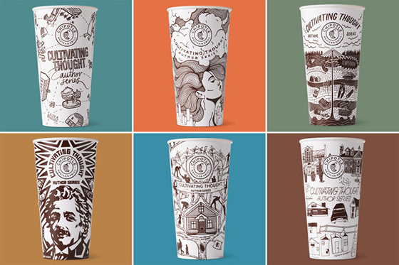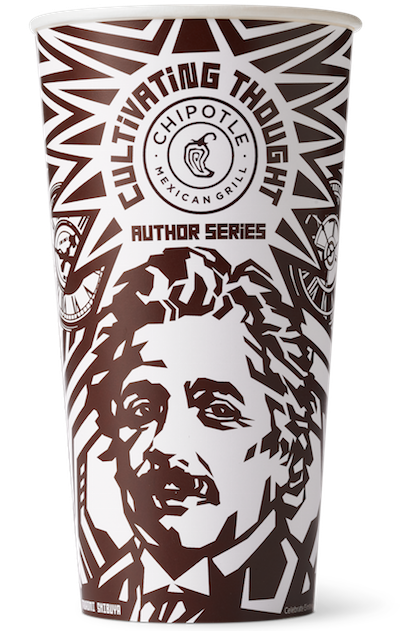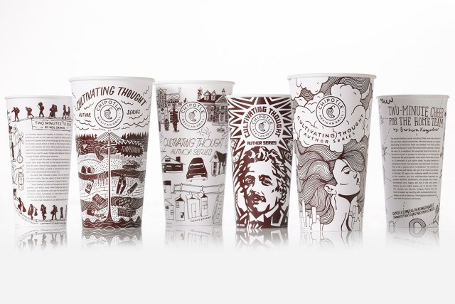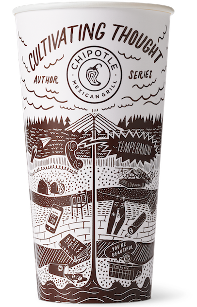 The other day, I stopped by a local Chipotle restaurant for my favorite fast food tofu burrito. I was happy to find that they had a full set of the Mexican food chain’s new Cultivating Thought packaging. The second installment of the series once again offers original art work and “two-minute” stories and essays. Designed to entertain eaters while exposing them to thought provoking writing, the new set has contributions by Neil Gaiman, Amy Tan, Julia Alverez, Carlos Ruiz Zafrón, Barbara Kingsolver, Augsten Burroughs, Paulo Coelho, Jeffrey Eugenides, Walter Isaacson, and comic Aziz Ansari.