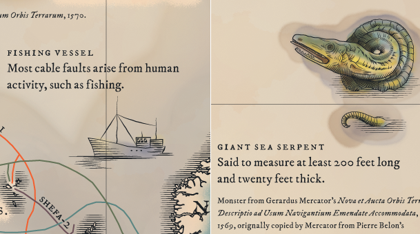 TeleGeography’s newly updated “Submarine Cable Map” is a wonderful tribute to the Golden Age of mapmaking incorporating historical elements of Medieval and Renaissance cartography. The fantastic map, which details 299 undersea communication cables, brings back a lost aesthetic of whimsical and fanciful details that once embellished European maps.