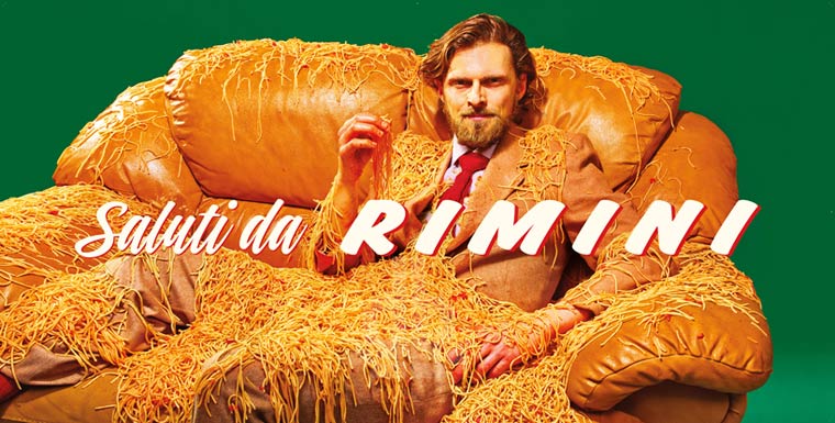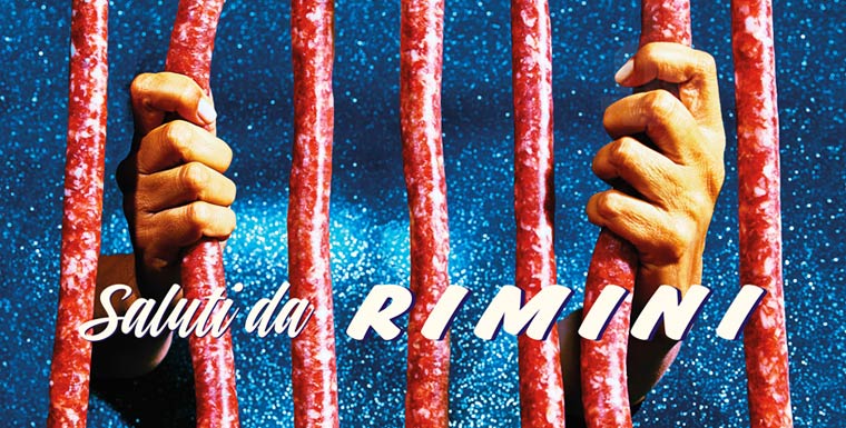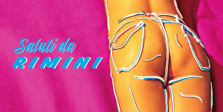 The “Saluti da Rimini” project riffs on tacky vacation postcards and trifles with stereotypes of Italian seaside resorts. Surprisingly, posters from the issue are plastered around the Adriatic seaside resort city of Rimini, including at the very appropriate piazzale Fellini.