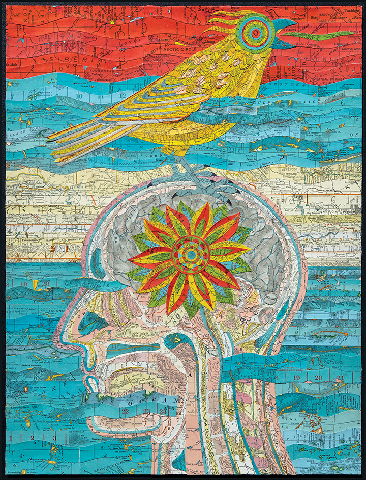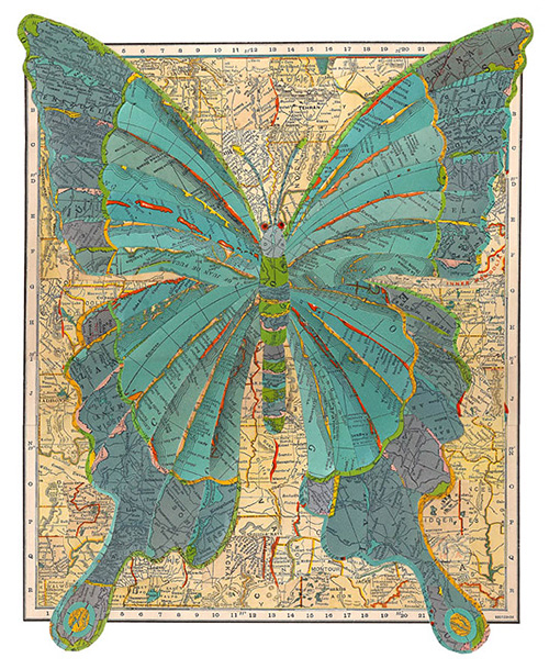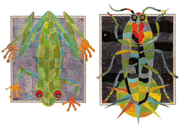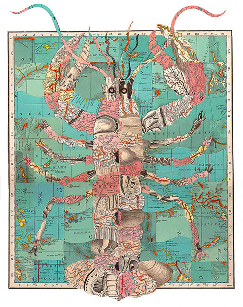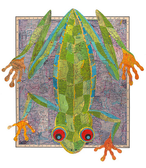 The late American artist and illustrator David McLimans published widely in periodicals as varied as The Atlantic, Washington Post and New York Times, and was awarded a Caldecott Medal for his children’s book Gone Wild: An Endangered Animal Alphabet. I especially like his series of map collages featuring animals and insects.