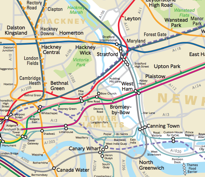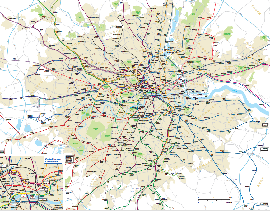 The TfL London Connections Map, which wasn’t available until a Freedom of Information request, reveals the network overlaying main roads, rivers, parks, and boroughs. This version makes it much easier for visitors to London to estimate distances to sights and journey lengths. You can explore—and download—an excellent pdf version of the “secret” map at this website.