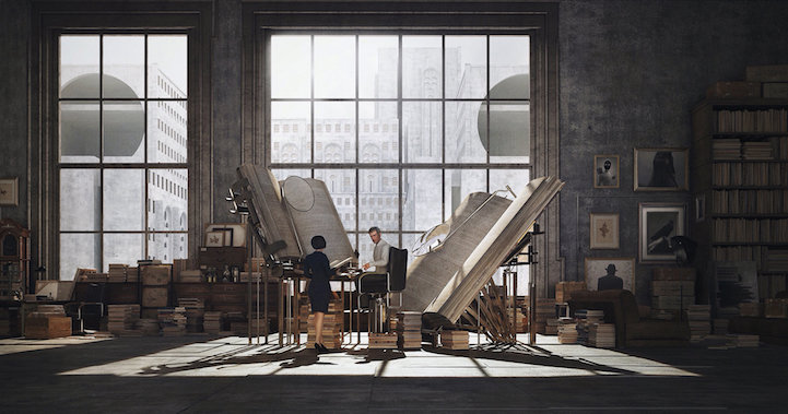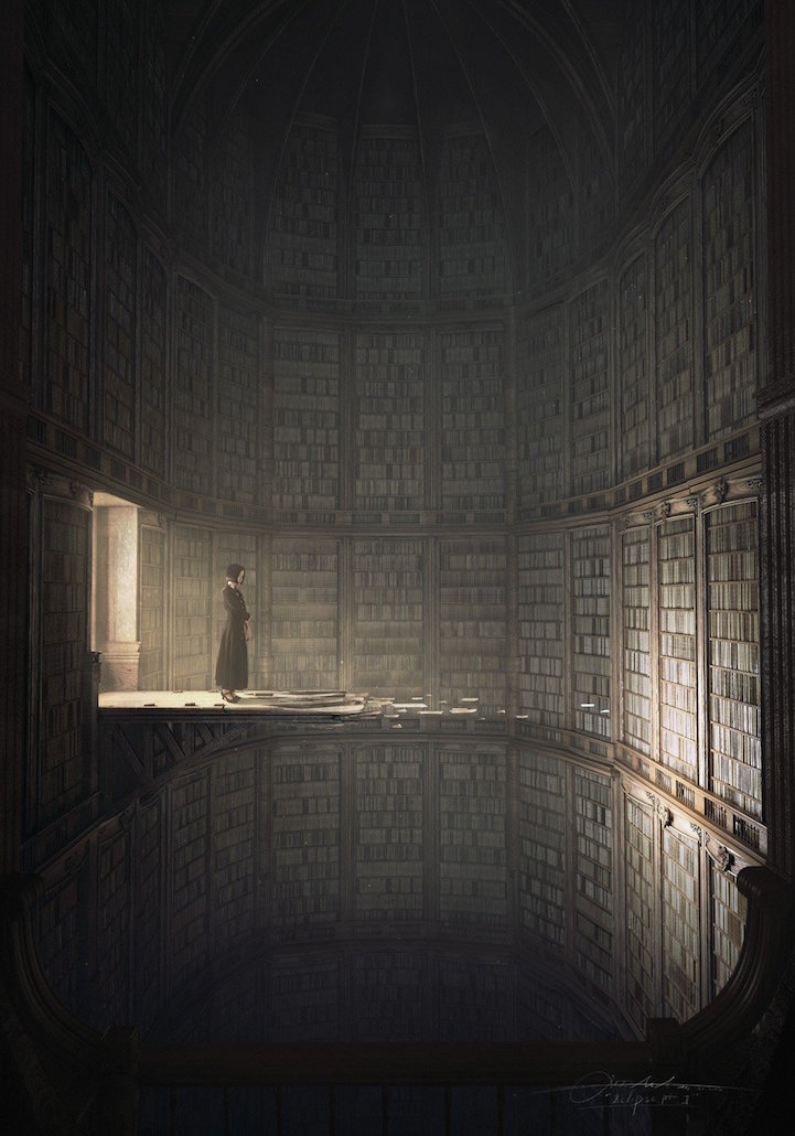 Shanghai-based artist Jie Ma’s imagined libraries are surreal, literary dreamscapes that intrigue and challenge the viewer. The extraordinary digital images offer fantastic sci-fiesque libraries of the mind.