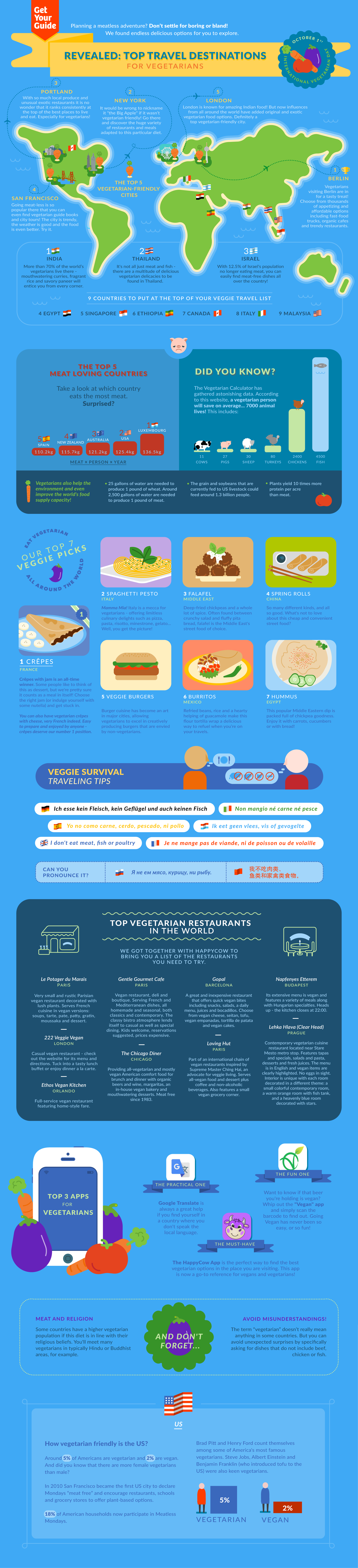 As a long-time vegetarian, I’m always happy to discover any resource for vegetarian-friendly travel. This helpful infographic from Berlin-based Get Your Guide offers some good tips and information. I never travel without consulting HappyCow.net.