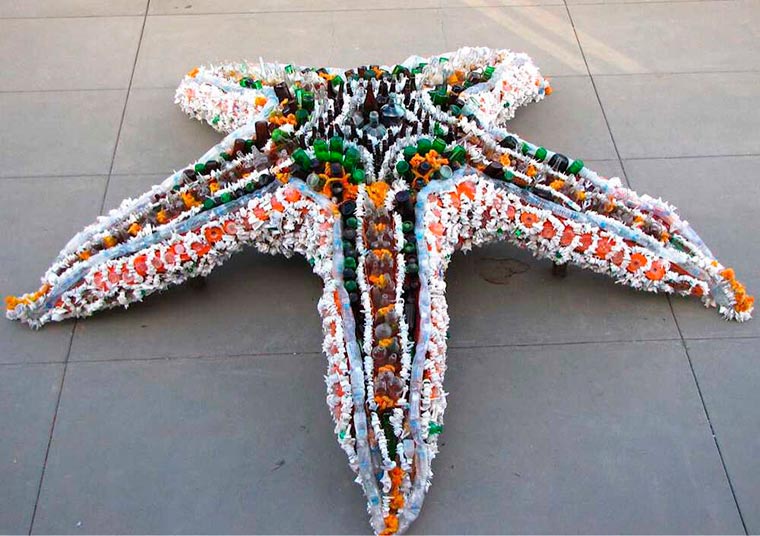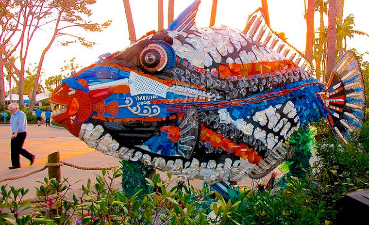 Under the direction of lead artist Angela Haseltine Pozzi, Washed Ashore has organized thousands of volunteers who have collected more than 17 tons of plastic debris from beaches. Some of the trash, which is 90% petroleum-based plastic, has been transformed into colorful sculptures of marine creatures.