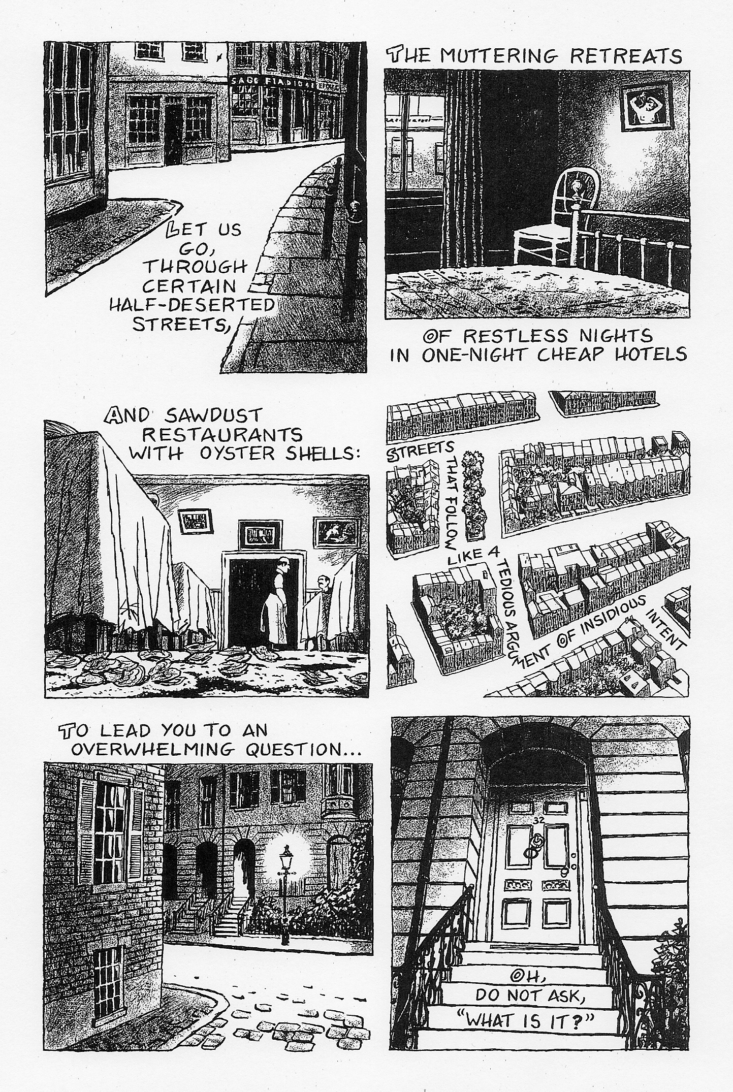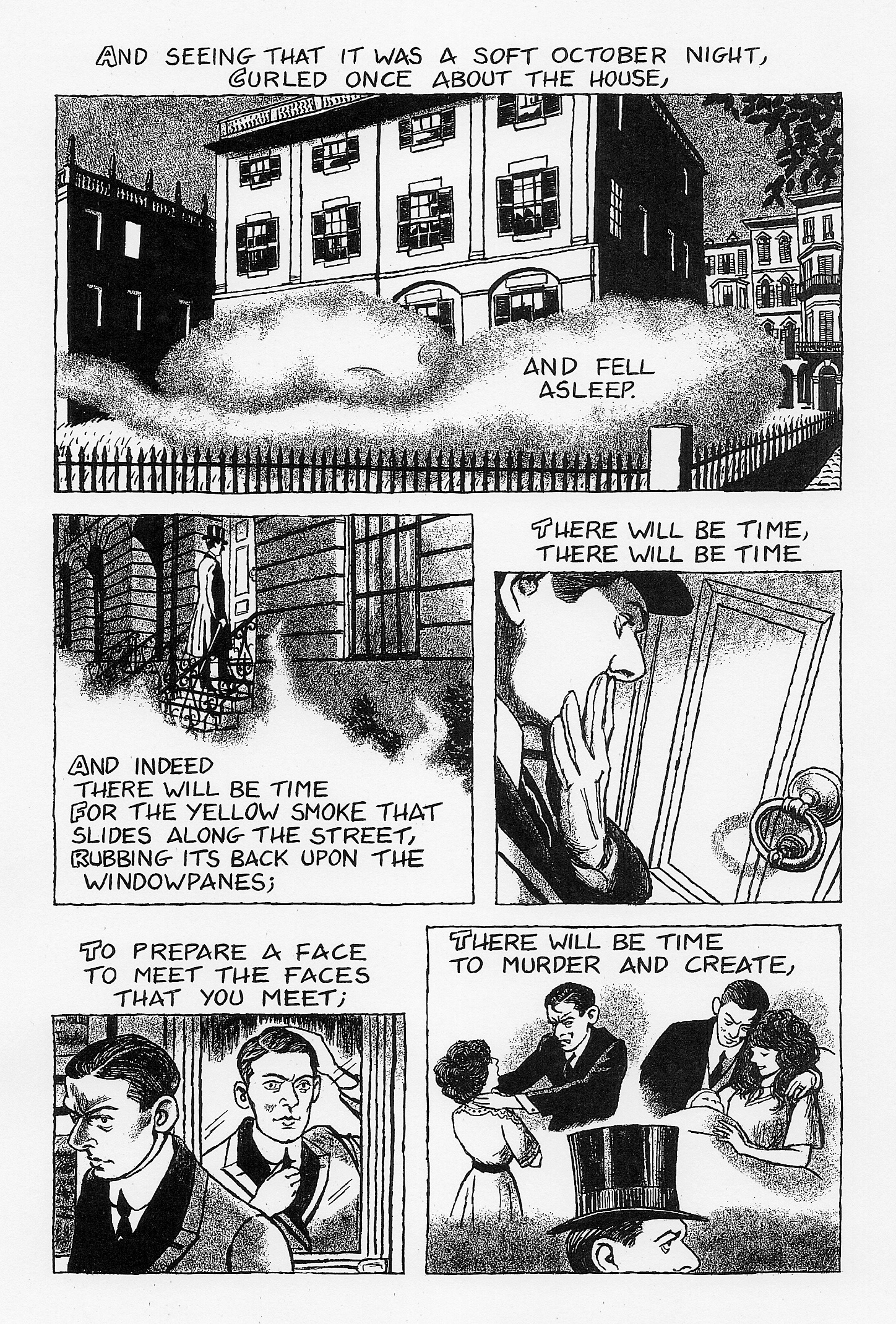 Montreal-based comic book artist and illustrator Julian Peters has created a terrific graphic version of T.S. Eliot’s classic poem “The Love Song of J. Alfred Prufrock”. Here’s a sample, but you can see the rest in its entirety on Peters’ blog.