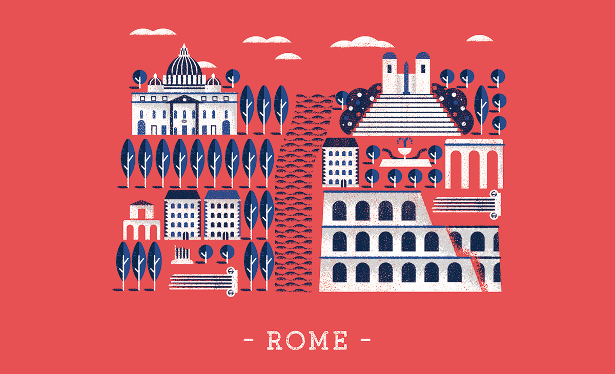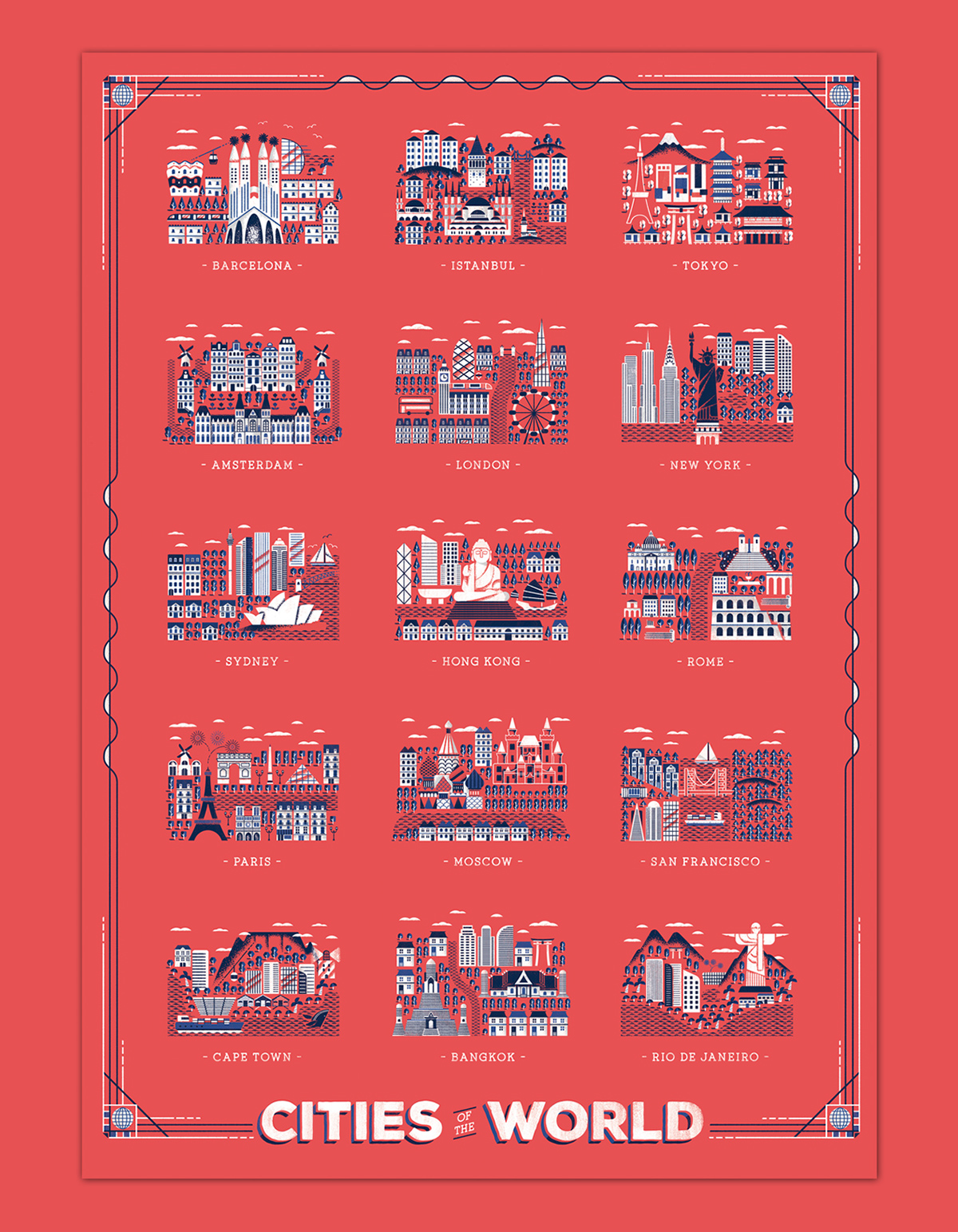 London-based, Italian illustrator and graphic designer Daniele Simonelli created the charming poster below of fifteen cities with their iconic landmarks for the travel app Great Little Place. You can see more of his terrific work here and you can check out the nifty app here.