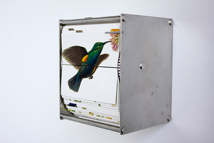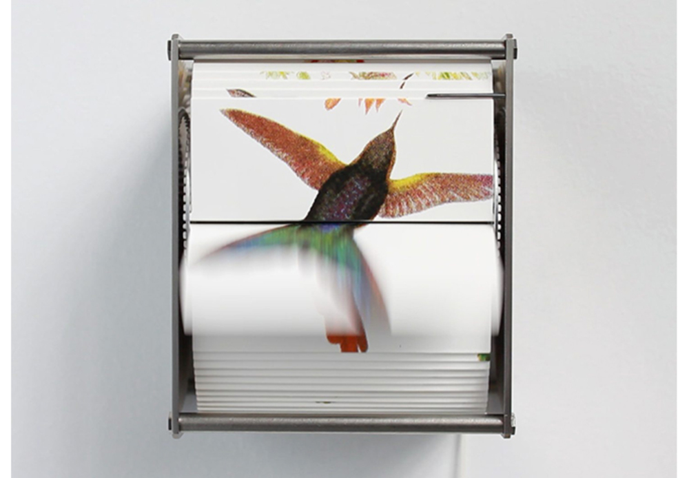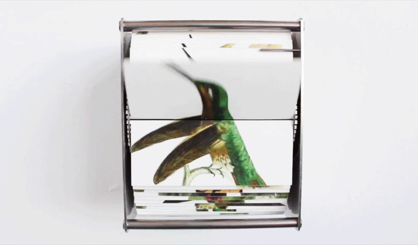 Brooklyn-based artist Juan Fontanive creates extraordinary automated flipbooks, which illuminate the flight of brightly colored birds and butterflies. The steel framed “books” contain gorgeous screen printed images on paper.