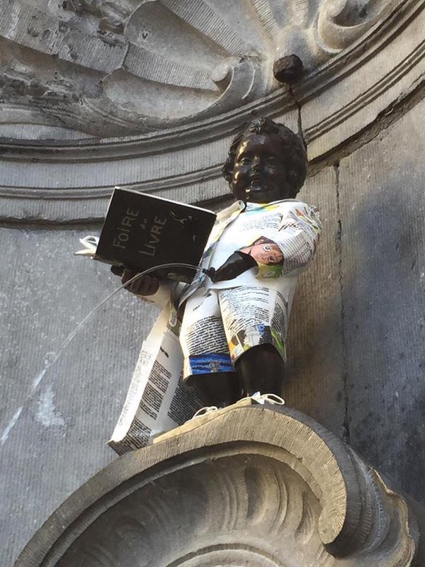 I was amused to see that this year’s Foire du Livre de Bruxelles is being promoted by the city’s unofficial mascot. The Manneken Pis, a diminutive 17th century bronze statue, is dressed in a new print covered outfit and is holding a book to celebrate the annual book fair.