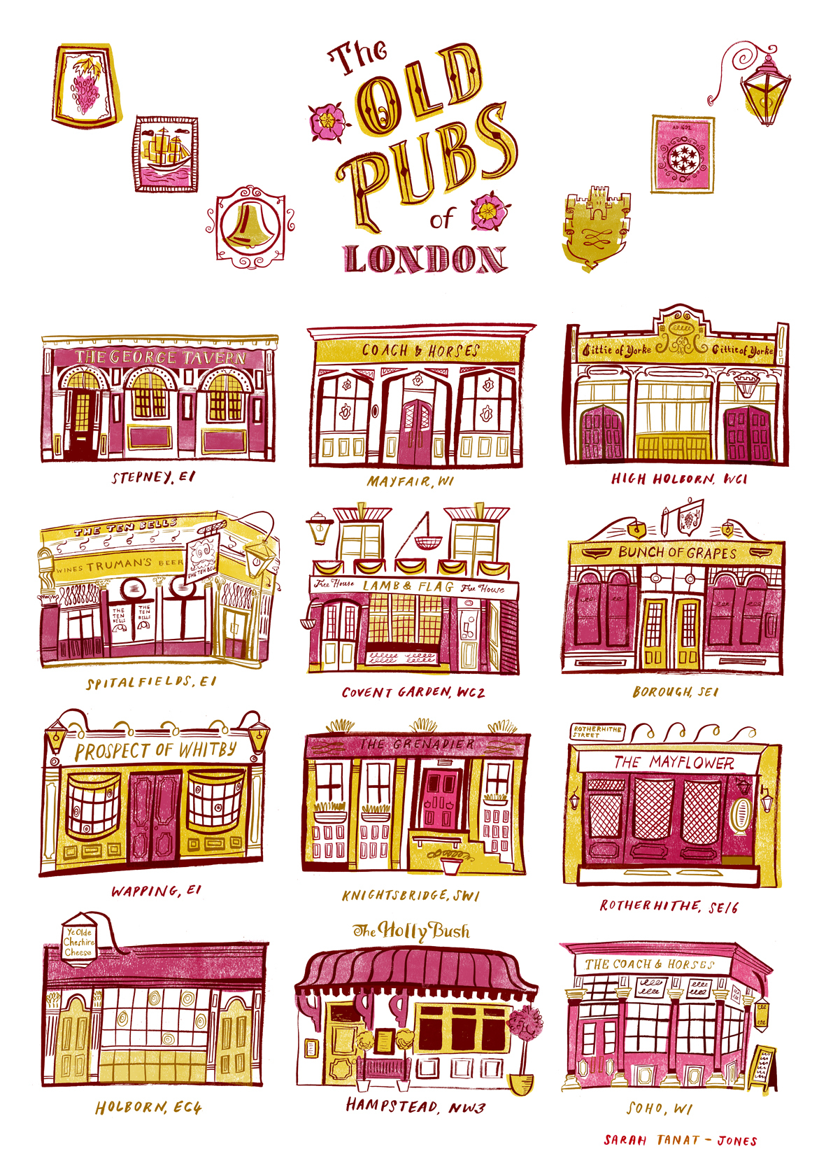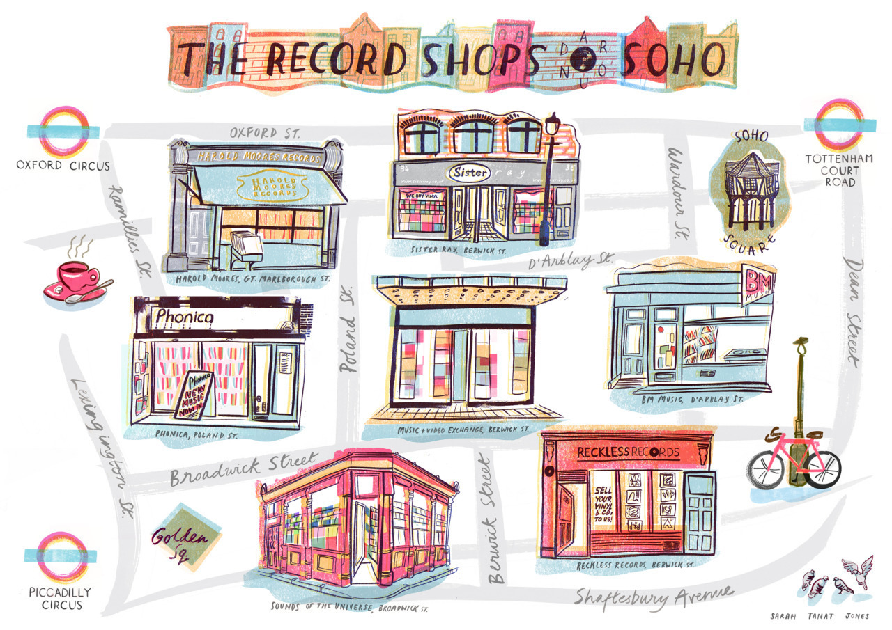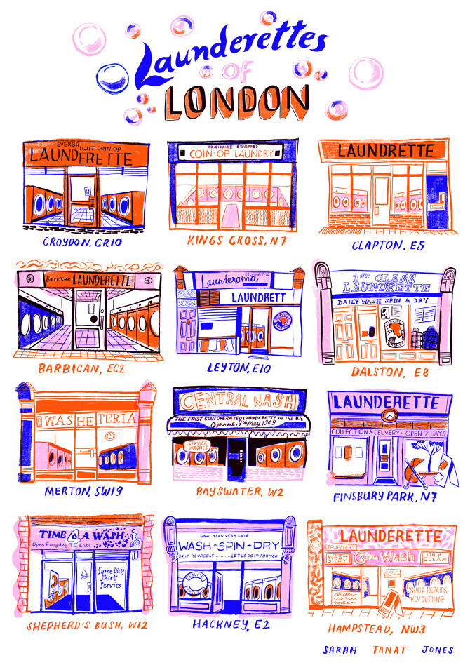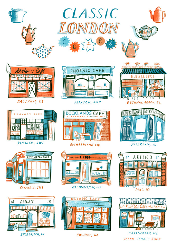 You may have seen the colorful, whimsical work of London-based artist Sarah Tanat Jones in periodicals or ads. Her marvelous drawings and illustrations are always a treat. I loved her recent London themed set. If you like them too, prints are available for purchase on her website.