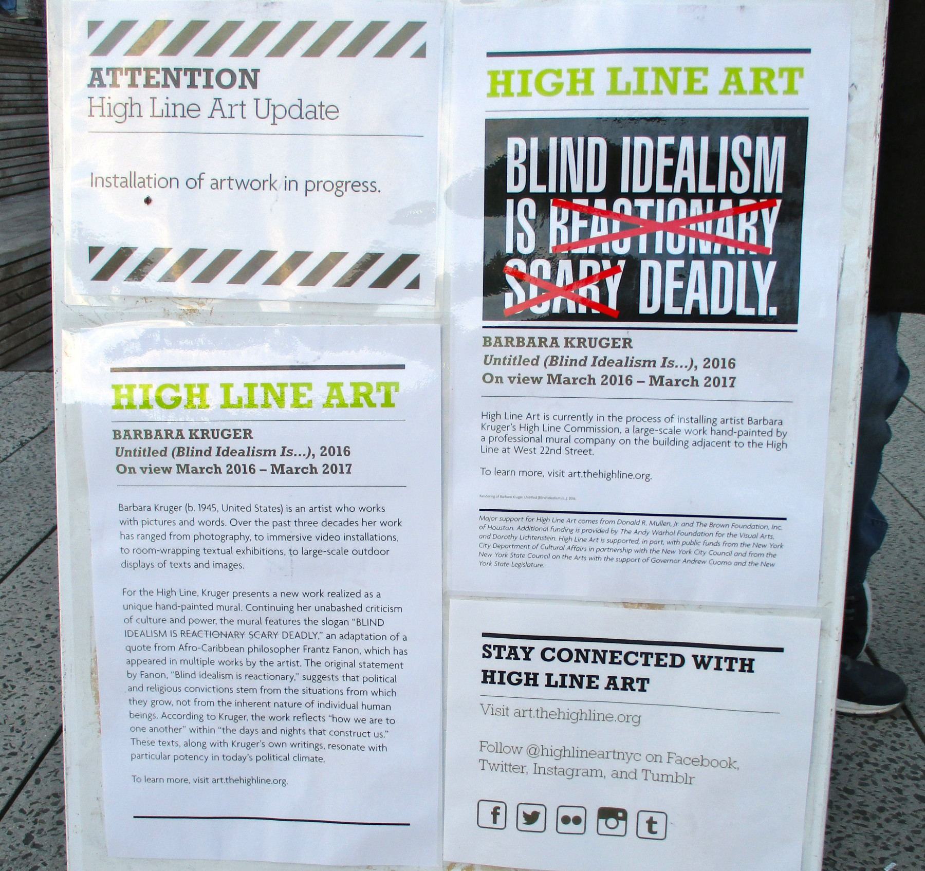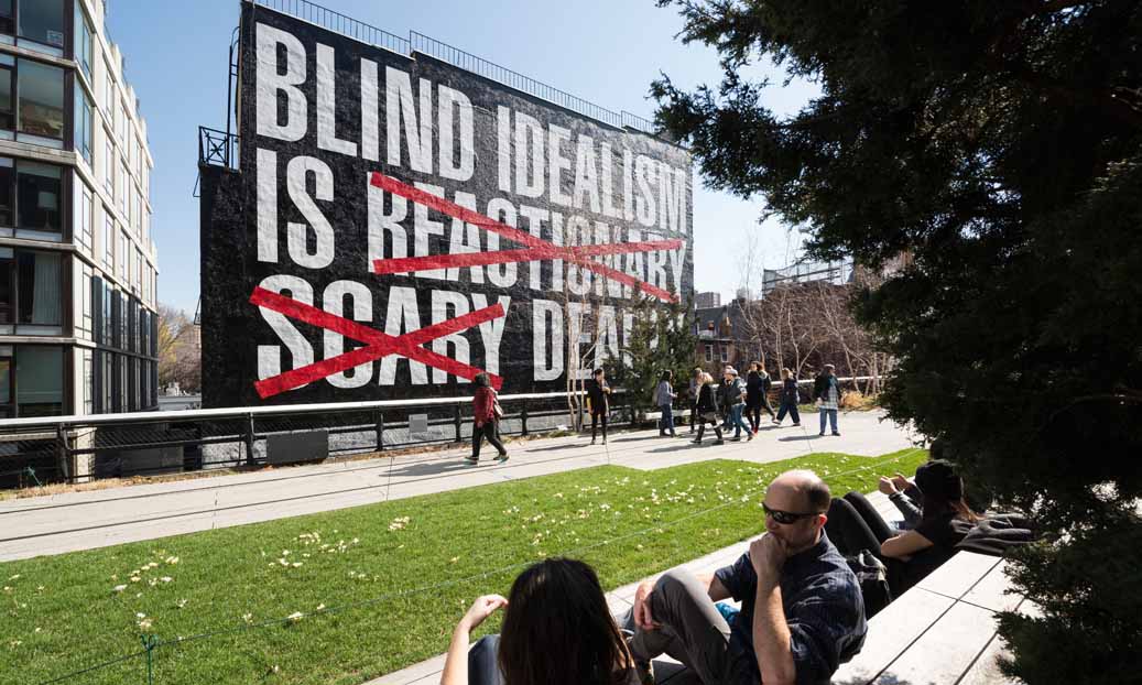 American artist and graphic designer Barbara Kruger is probably best known for her text-based art. You see her latest major work from New York city’s ever-popular High Line Park at West 22nd Street in Chelsea. The text is a play on a famous quote from the revolutionary philosopher Frantz Fanon—”Blind idealism is reactionary.”