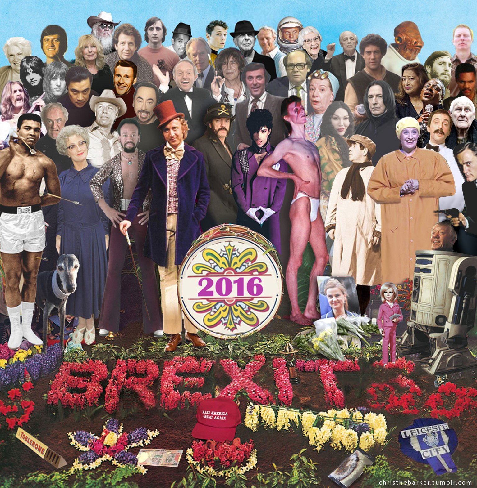 This year has seen so many devastating losses for the world in the arts and culture communities. A British Twitter user who only goes by the handle ChrisTheBarker has paid homage to the some of the many greats who died in 2016 with a recreation of the iconic Sgt. Pepper’s Lonely Hearts Club Band album cover. His assemblage includes David Bowie, Prince, Sharon Jones, Gene Wilder, Alan Rickman, Muhammad Ali, Leon Russell Leonard Cohen, and of course Beatle’s producer George Martin. And to acknowledge the tragic political events of 2016, a funeral floral arrangement “Brexit” replaces “Beatles” , while a “Make America Great” hat is featured just in case anyone forgot for a moment what the Trump Chump voters have done.