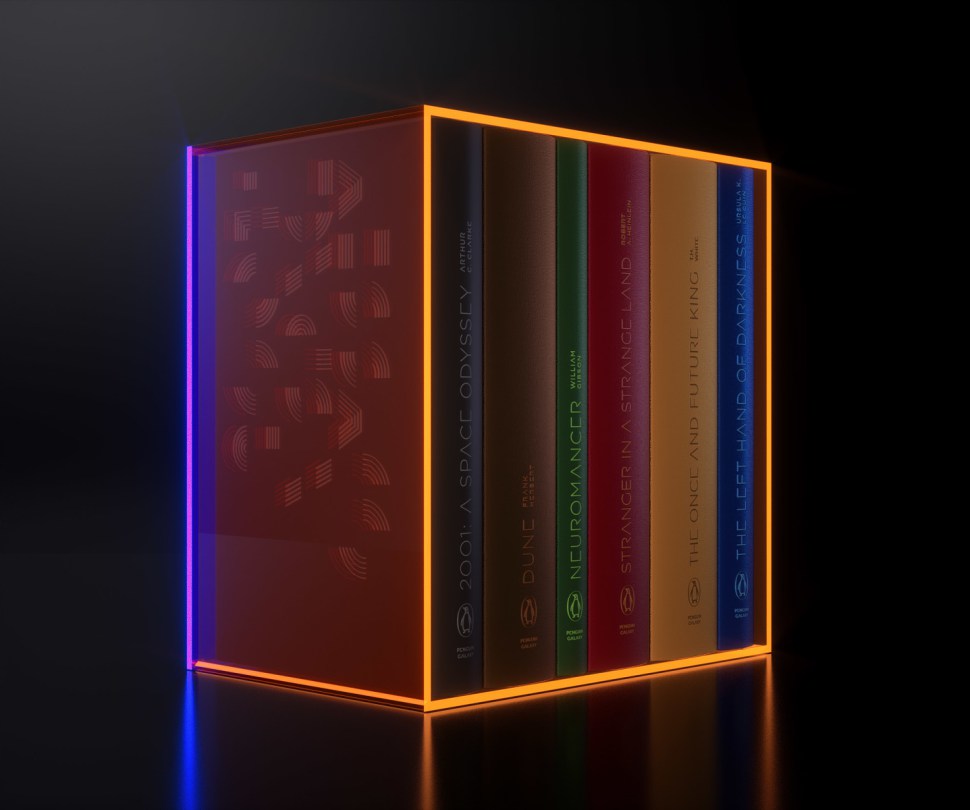 The box set includes Stranger in a Strange Land by Robert A. Heinlein; Dune by Frank Herbert; The Left Hand of Darkness by Ursula K. LeGuin; Neuromancer by William Gibson; A Space Odyssey by Arthur C. Clark; and The Once and Future King by T.H. White. Looks like a great gift for some sci-fi bibliophile.