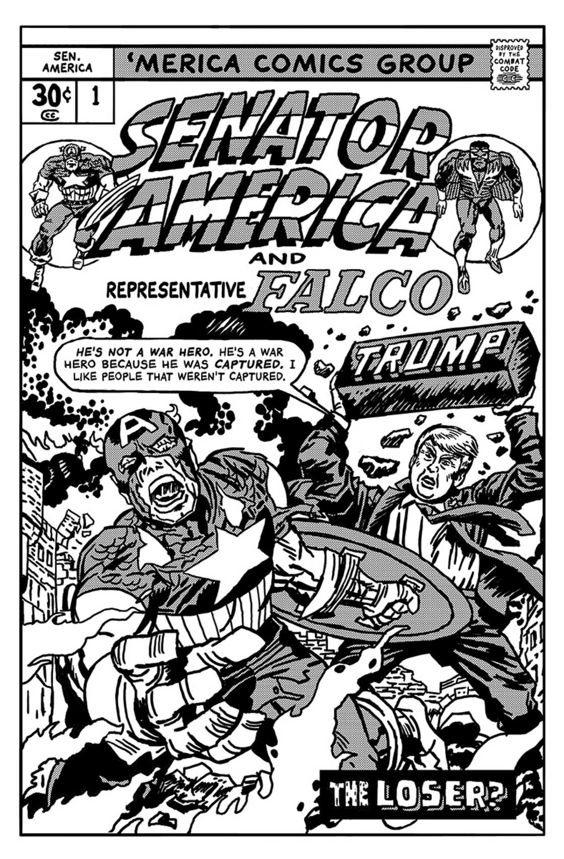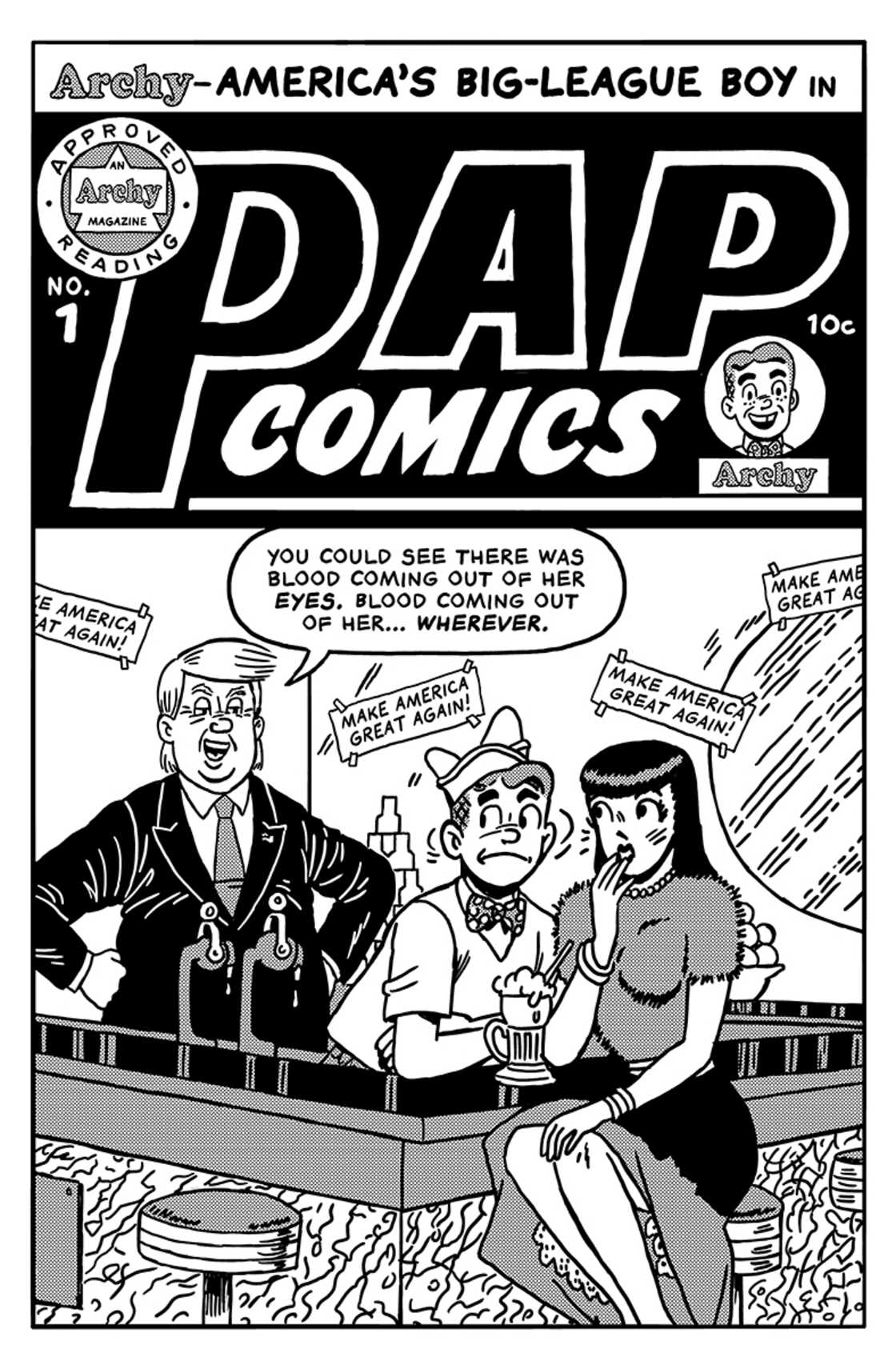 Illustrator Robert Sikoryak has been trying to cope with our national tragedy by transforming Donald Trump quotes into cartoons in the style of famous comic books and graphic novels on his blog Unquotable Trump. The rest of us are just wallowing in our disgust at the thought of that bloated, tangerine-colored pissoir becoming President of the United States. On behalf of all sane U.S. citizens I apologize in advance.