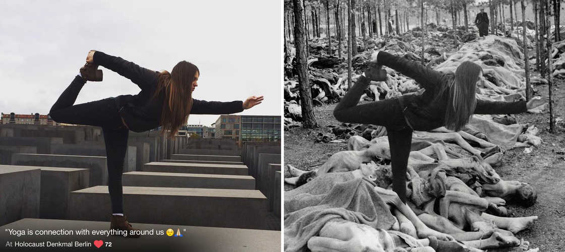 Many years ago, I chose to cut short my visit to the Terezín Concentration Camp in the Czech Republic due to the obnoxious behavior of groups of adolescents who laughed, joked, and generally clowned around with total disregard for the solemnity of the setting and the feelings of others. Artist and satirist Shahak Shapira has had a similar visceral reaction at Berlin’s Holocaust Memorial, but he’s done something about it. His Yolocaust website documents the loathsome activities of moronic tourists with screenshots from their own social media accounts and a side-by-side photoshopped image from the Holocaust. So far, only one of the featured flakes has contacted Shapira to apologize for their actions.