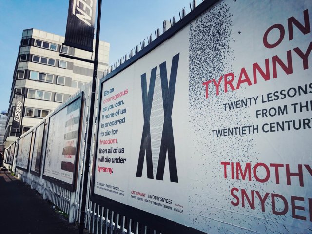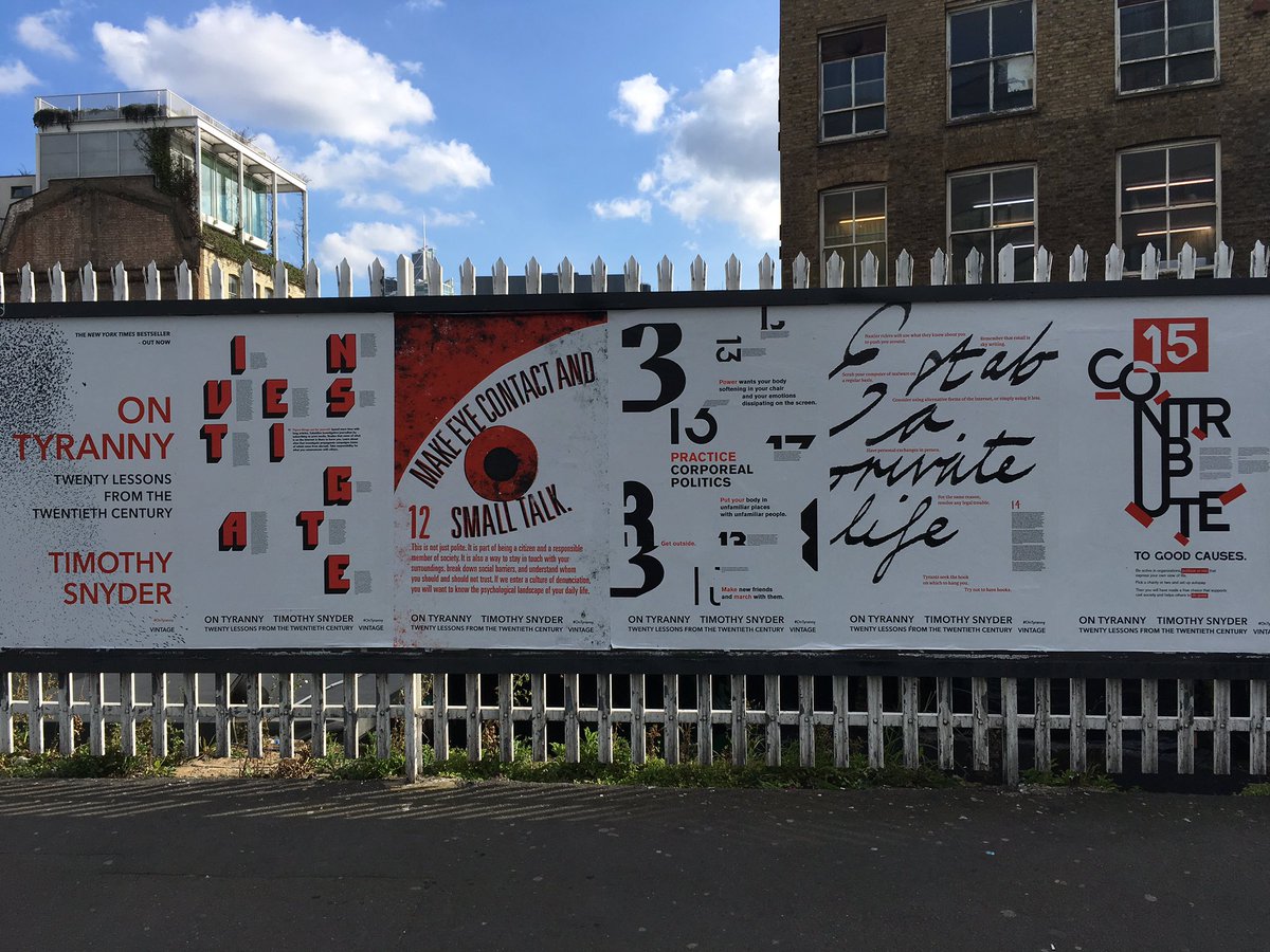 It may be just a marketing ploy by Penguin Random House, but the publisher has printed the text of Timothy Synders’ chilling book On Tyranny onto a series of large posters and put them up in east London. The powerful posters, which were created in collaboration with a team of university graphic design students, depict the Yale historian’s “Twenty Lessons From The Twentieth Century”. Mirroring 1930s and 40s propaganda graphics, the posters are a brilliant tool to both promote the book and educate the public on coping with tyrannical regimes.
