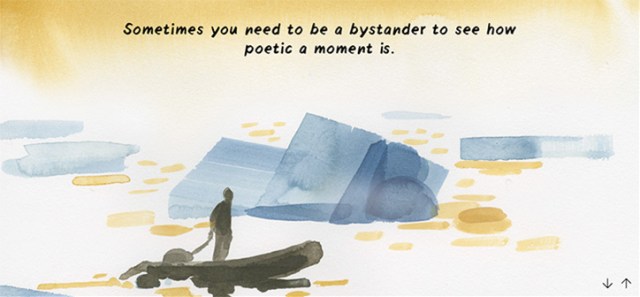 North: An Illustrated Travelogue is a click-through storybook on National Geographic’s website that documents Niemann’s excursion to Norway’s Fjords and Arctic Svalbard. Each page of the online journal is different: some are a hybrid of photography and illustration, with the illustrator’s recognizable pen drawings, depicting his illustrated self, interacting with photos of the landscape. Others are entirely watercolor painted scenes, whimsically charming and capturing the magic of the rugged region of the world.Some pages purely feature Niemann’s handwritten notes, or annotated maps, while a few mix hand-drawn animation and video.