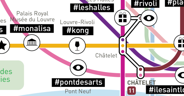 While some of the hashtags are self-evident, such as #pontdesarts and #monalisa, others like #badaboum and #silencio may require some research. Each of the tags that Fischer has chosen is based on Instagrams within 300 meters of the Metro stop.