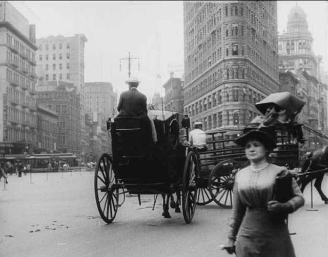 This documentary travelogue of New York City was made by a team of cameramen with the Swedish company Svenska Biografteatern, who were sent around the world to make pictures of well-known places. (They also filmed at Niagara Falls and in Paris, Monte Carlo, and Venice, although New York 1911 is the only selection in the Museum’s collection.) Opening and closing with shots of the Statue of Liberty, the film also includes New York Harbor; Battery Park and the John Ericsson statue; the elevated railways at Bowery and Worth Streets; Broadway sights like Grace Church and Mark Cross; the Flatiron Building on Fifth Avenue; and Madison Avenue. Produced only three years before the outbreak of World War I, the everyday life of the city recorded here—street traffic, people going about their business—has a casual, almost pastoral quality that differs from the modernist perspective of later city-symphony films like Paul Strand and Charles Sheeler’s Manhatta (1921). Take note of the surprising and remarkably timeless expression of boredom exhibited by a young girl filmed as she was chauffeured down Fifth Avenue in the front seat of a convertible limousine.