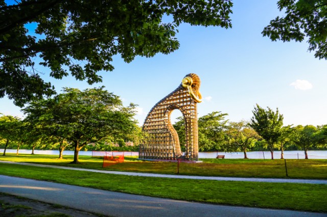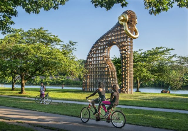 Big Bling, which will stand through November 2017, is the work of celebrated American sculptor Martin Puryear. The 40 foot tall by 40 foot long work is constructed of laminated timbers, plywood, chain-link fencing, fiberglass, and gold leaf. Everyone has their own take on he abstract sculpture, but i keep thinking: elephant.