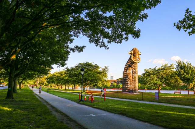 I have been chided in the past for posting images of international street art and overlooking the remarkable public artwork extant in my own backyard. So, here’s a look at a phenomenal temporary sculpture that towers 40 feet above the Schuylkill River in Philadelphia’s massive Fairmount Park.