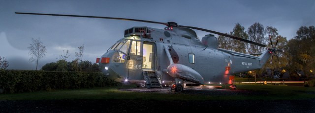 We’ve seen lots of airplanes that have been converted into hotel accommodations, but this is the first helicopter to make the transition. The folks at Helicopter Glamping in Stirling, Scotland purchased a decommissioned Sea King search and rescue chopper from the Royal Navy for only £7,000 and transported it by road to a pastoral campsite at Thornhill near Stirling.