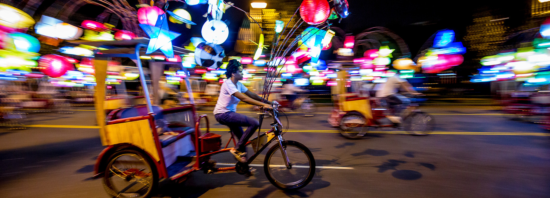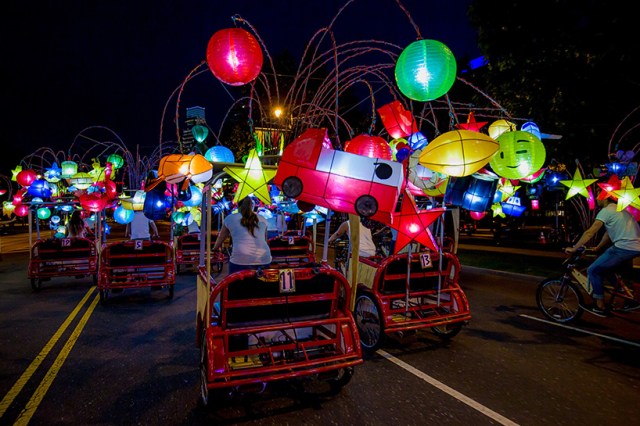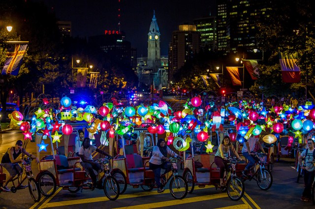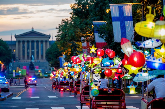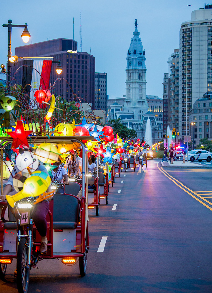 The Parkway celebration, which will run from September 8, 2017 to November 16, 2018, will begin with a parade of illuminated pedi-cabs created by artist Cai Guo-Qiang. The people-powered cabs will be decorated with hundreds of colrful Chinese lanterns in the form of animals, emojis, rockets, vehicles, and food. The pedi-cabs will provide free rides along the Parkway four nights per week between September 14 and October 8, 2017.