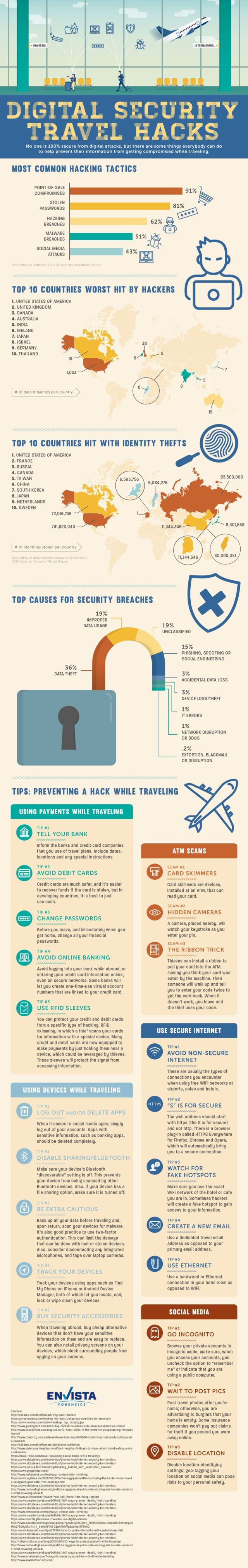 It seems that every day we hear about a new travel scam or digital threat to worry about when we are away from home. This infographic from the security consulting group Envista Forensics does a good job explaining many common threats and raises so new ones for the wary traveler. Personally, I never knew about the ribbon trick, although I certainly wouldn’t share my password with a stranger.