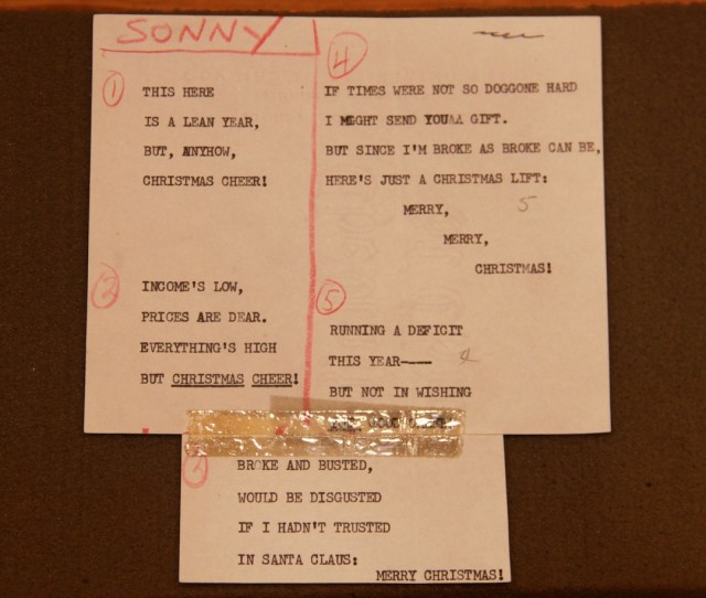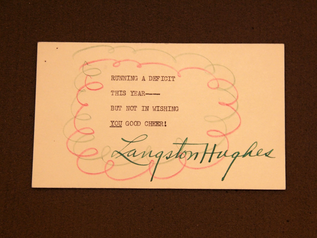 The draft typescript for this and other cards in a series of Christmas greetings are among the extensive Langston Hughes Papers in the Yale Beinecke Rare Book and Manuscript Library. The Hughes archives were given to Yale University by the author beginning in 1941, continuing throughout his lifetime, and including more materials from his estate upon his death in 1967.