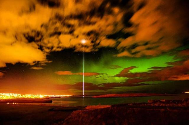 The Imagine Peace Tower is a dramatic and moving memorial to John Lennon that was built by Yoko Ono on Viðey Island just off Reykjavik, Iceland. The monument consists of a round stone base with the words “Imagine Peace” inscribed in 24 languages and a light installation that reflects a powerful beam 10 meters wide and 4000 meters high. Although it’s possible to visit the memorial all year round, it is only illuminated from October 9th (the date of Lennon’s birth) through December 8th (the date of his murder) and also on the Winter Solstice, New Year’s Eve, and for one week during the Spring Equinox.