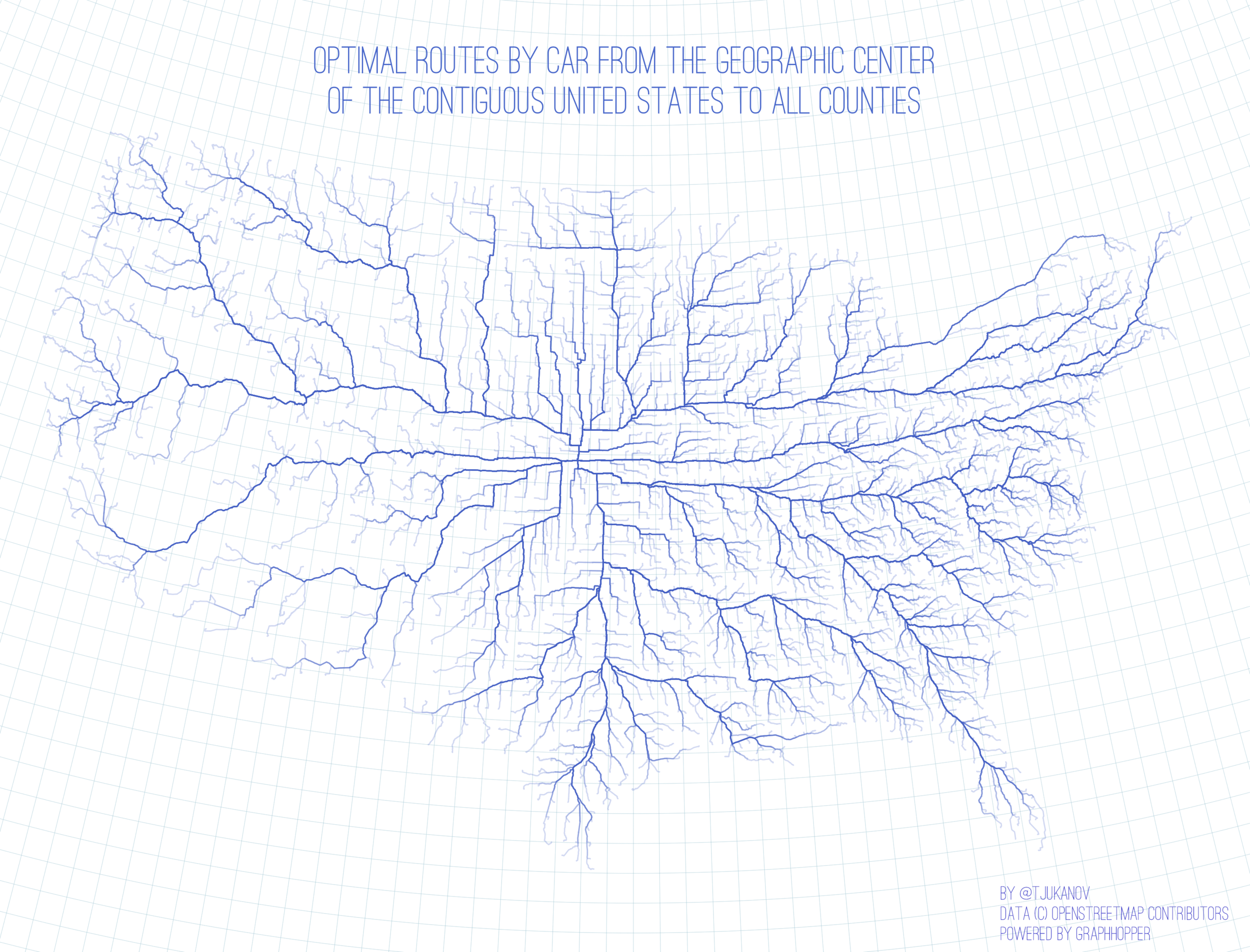 Helsinki-based geographer Topi Tjukanov is a wizard at using spatial data from new perspectives. If you’ve ever done any roadtripping in the US, this map of optimal routes by car from the geographic center of the country to all counties will blow your mind.