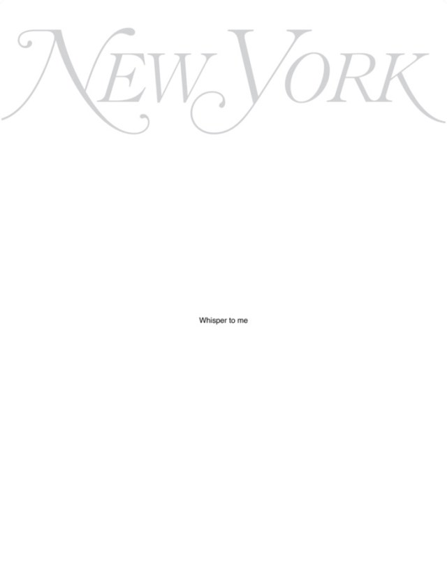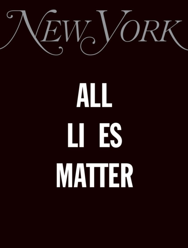 The eight released covers showcase new work made for the magazine. Many of the covers are dominated by text. Hank Willis Thomas’ all-black cover is highlighted by white text reading “ALL LI ES MATTER” in white upper case lettering. Yoko Ono’s cover is strikingly sparse, all white bearing three simple words of text: “Whisper to me”. Rob Pruitt has made use of a more contemporary alphabet than his peers, taking Milton Glaser’s “I ♥ NY” and changing it into emojis displayed on an iPhone.