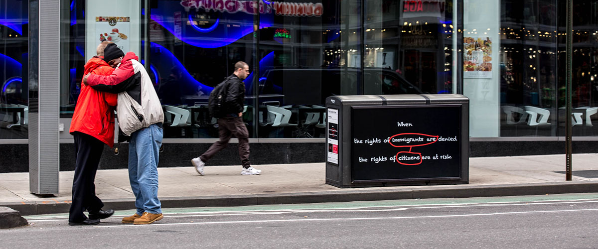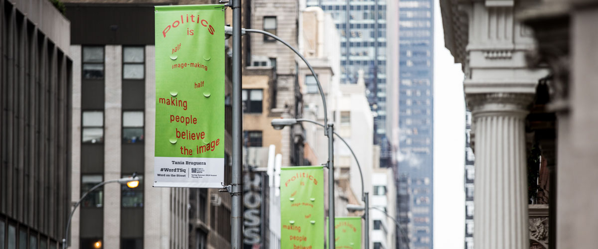 Each of the art works is first fabricated by a group of female refugees based in Texas and then photographed and printed for display on pole banners and trash bins. The “Spring Edition” of Word on the Street includes pieces from renowned writers and artists, including the inimitable Laurie Anderson, A.M. Homes, Tania Bruguera, and Naomi Shihab Nye.