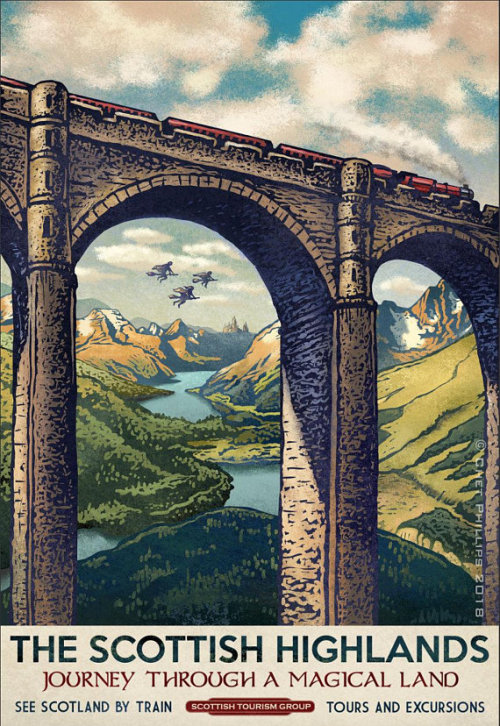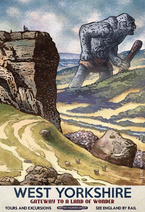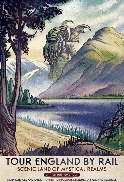 Austin, Texas-based artist and illustrator Chet Phillips has re-imagined vintage British travel posters in a marvelous series of fantasy and horror themed postcards and posters. The set includes a dragon, Doctor Who, a troll, Harry Potter, a giant, and Cthulu. Prints and postcards are available from the artist’s website.