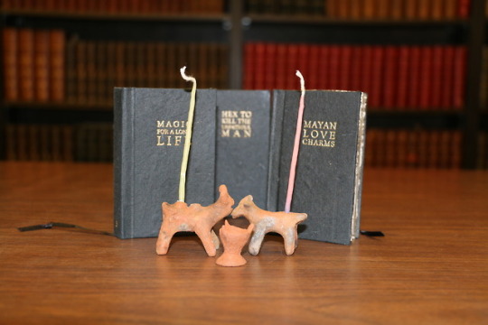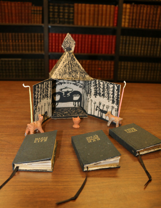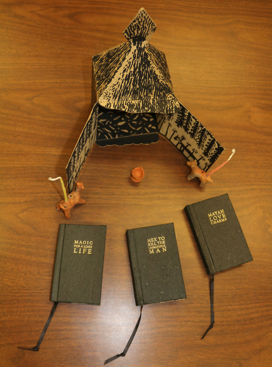 The Portable Mayan Altar was created by Taller Leñateros (The Woodlander’s Workshop), an indigenous publishing house in Chiapas, Mexico founded by poet Ámbar Past in 1975. This book features a cardboard case in the form a traditional Mayan house that opens up to an altar with two side panels. It also includes a clay pot-shaped incense burner, tiny colored candles, two clay candle holders in the form of animals, and three small pocket books illustrated by Mayan artists: Mayan Love Charms (Petra Hernández), Magic for a Long Life (Manwela Kokoroch), and Hex to Kill the Unfaithful Man (Tonik Nibak).