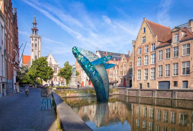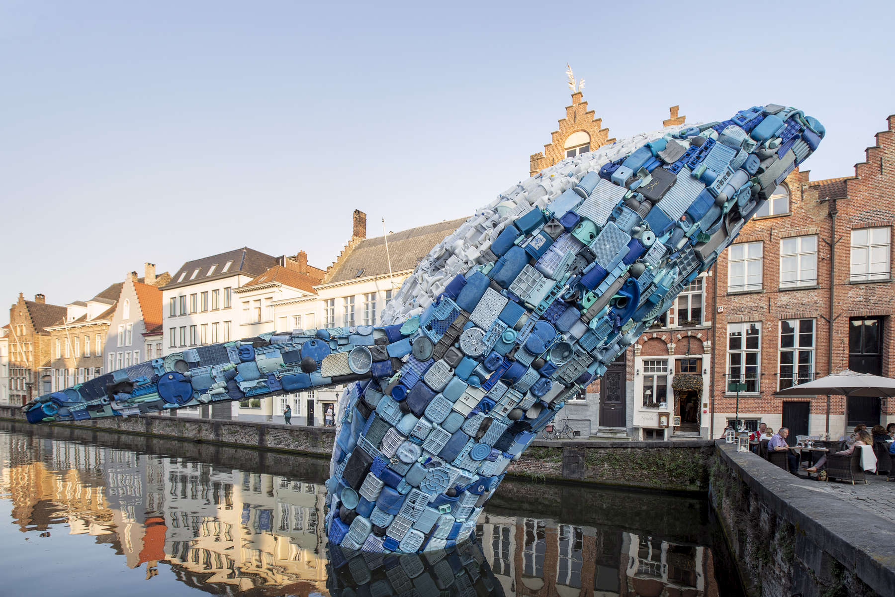 The New York City-based architecture and design group STUDIOKCA transformed more than four tons of plastic waste recovered from the Pacific Ocean near Hawaii into a four-story sculpture of a whale. The recycled leviathan was then installed in a picturesque canal in Bruges, Belgium.