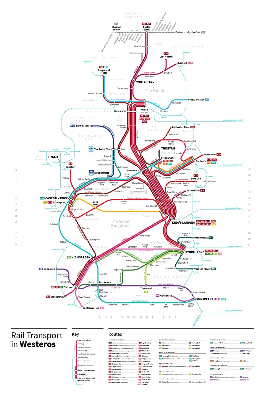 Those of you who follow TBTP on a regular basis probably know by now that I am a big fan of George R.R. Martin’s work and that I am inordinately interested in transit maps for some mysterious reason. So of course I love this super clever fictional Rail Transport in Westeros map. The wonderful graphic was created by New York City-based designer Michael Tyznik, who is selling poster versions of the map here.