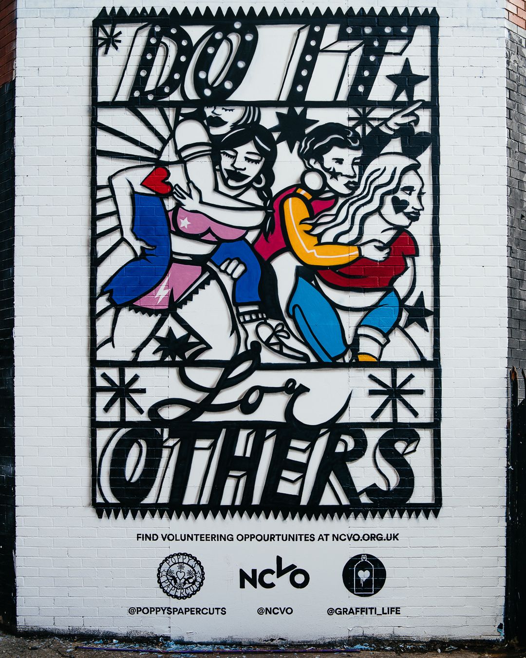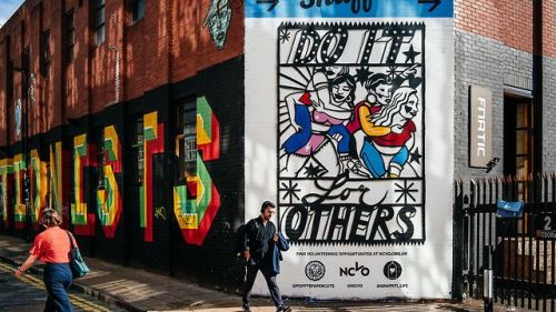 The mural shows a group of women giving each other piggybacks with the slogan “Do It For Others”. The project is supported by NCVO, an organization that encourages volunteering and the positive impact it has on society. To discover more check out ncvo.org.uk.